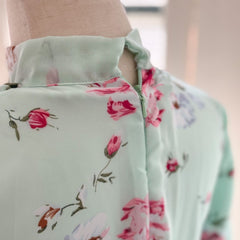 A mint green floral maxi dress with a high ruffled neckline and long bishop sleeves. It features an elastic waist and a soft, flowy silhouette, perfect for a romantic, breezy look.