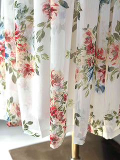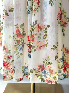 Style: A soft white long maxi dress adorned with delicate red and blue floral prints, now beautifully enhanced with small hand bead detailing on the bodice and sleeves that adds a subtle shimmer. It features a round neckline, full sleeves, and a fitted waist that flows into a graceful, flared skirt. The light, airy fabric combined with the tiny beadwork gives it a soft, elegant, and slightly dressy spring look — perfect for daytime events, brunches, or intimate gatherings. ✨