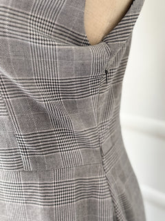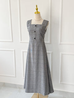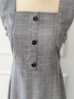 Style: The dress is a grey pinafore style with a classic glen check pattern, featuring a square neckline, front button detailing, and an elegant A-line silhouette.