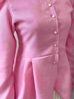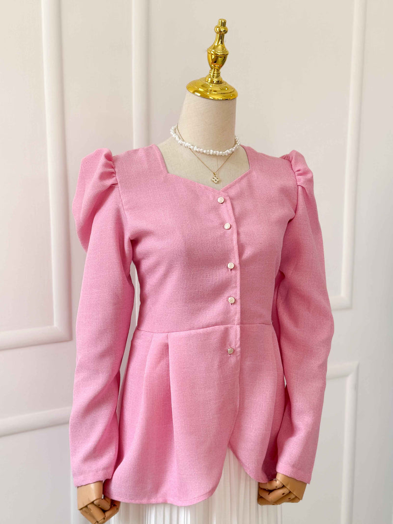 Style: A soft pink peplum-style top featuring a gentle flare that adds a feminine silhouette. A sweetheart-inspired neckline and delicate buttons give it a refined, romantic touch. A subtly puffed-sleeve design that brings charm, elegance, and a sweet bestie vibe.