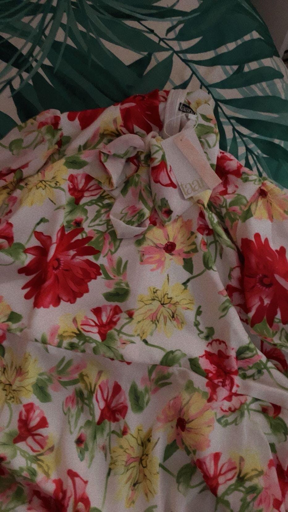 Style: A blooming floral dream with a soft flow.A-line cut featuring bishop sleeves and dainty red cuffs. Accentuated with a neck-tie for a polished, feminine finish.