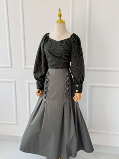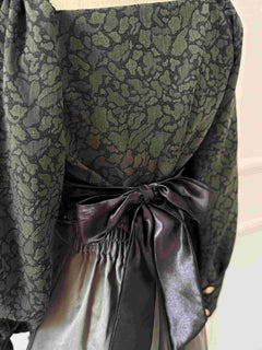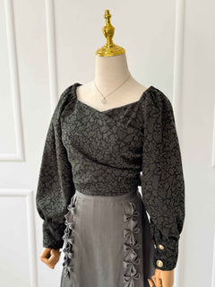 Style: A dark green puff-sleeve top with a subtle floral texture, featuring a draped neckline and gold buttoned cuffs for an elegant finish.