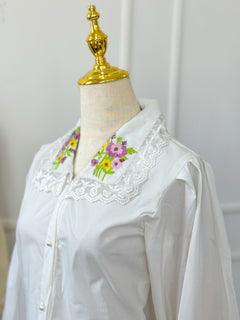 Style: A white blouse with embroidered floral details on the collar and lace trim on the cuffs